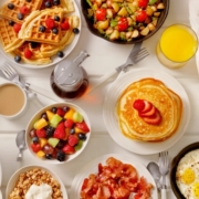 All You Can Eat Breakfast Buffet You can get regular or western style scrambled eggs, bacon, sausage, ham, potato gems, pancakes, French toast, sausage gravy & biscuits, fresh fruit salad, orange juice and coffee for just $13.00!